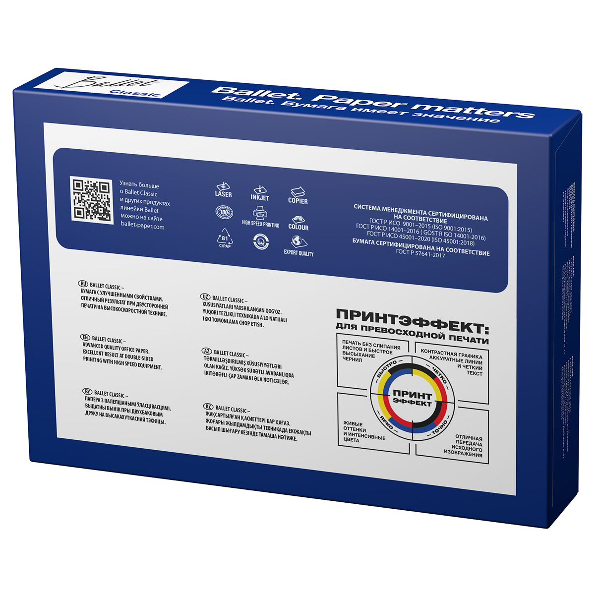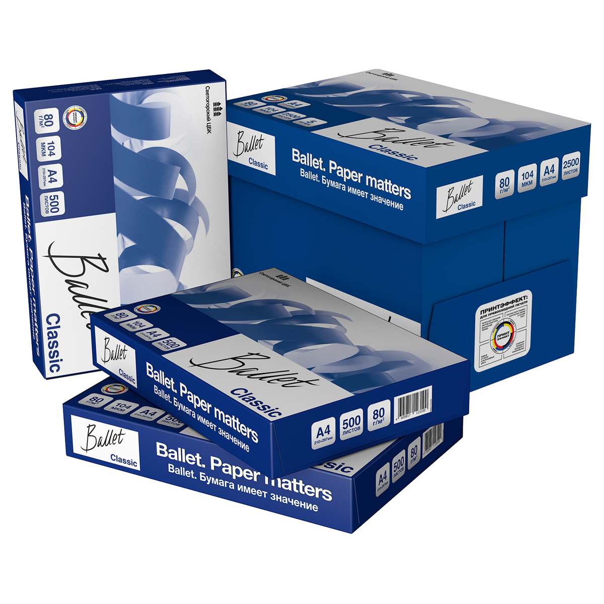 Ballet Classic - универсальная бумага марки «B» в соответствии с ГОСТ Р 57641-2017 для печати в офисе. Идеально подходит для печати графиков, иллюстраций, коммерческих предложений и важных отчетов. Плотность 80 г/м2; яркость 107%, ISO; белизна 153 по CIE. Страна-производитель Россия.Характеристики