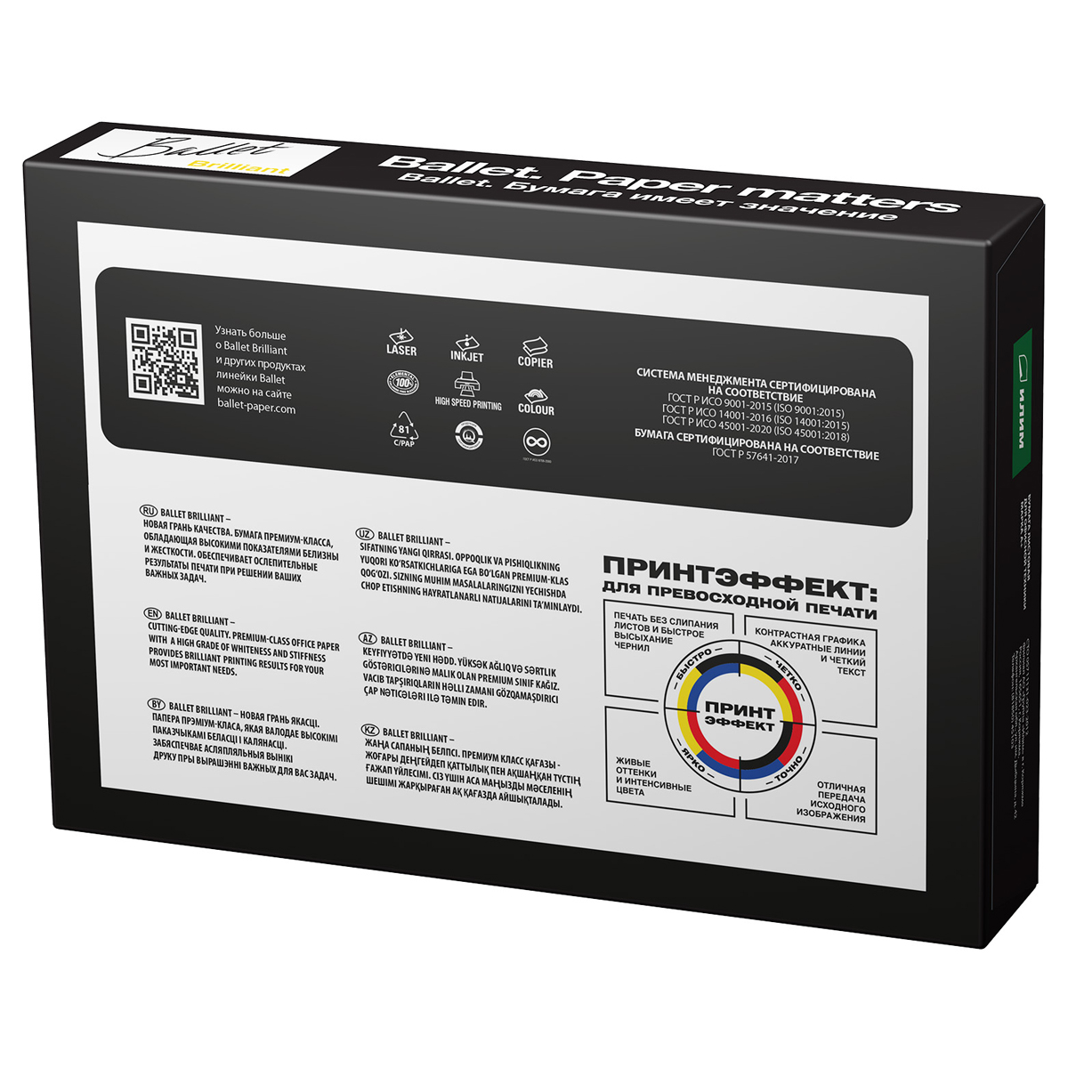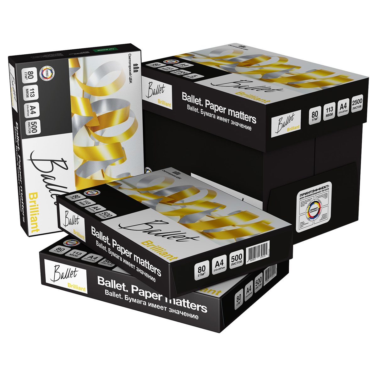Ballet Brilliant - многофункциональная бумага марки «А» в соответствии с ГОСТ Р 57641-2017 повышенного качества. Превосходные результаты печати, как на цветном, так и на черно-белом лазерном и струйном принтерах, копировальных аппаратах. Плотность 82 г/м2; яркость 112%, ISO; белизна 168 по CIE. Страна-производитель Россия.Характеристики