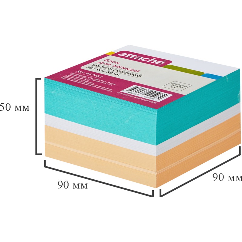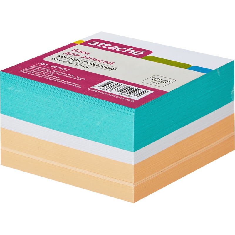 Блок для записей Attache предназначен для работы в офисе или дома. Будет полезен в использовании для рабочих процессов и повседневных задач, а также при проведении совещаний, обучений, мозговых штурмов. Идеально подходит для работников офиса.Блок высотой 5 см сложен из квадратных листов размером 9×9 см. Листы склеены между собой. Листы изготовлены из высококачественной офсетной бумаги плотностью 80 г/м2. В блоке представлены листы трех цветов: белого, оранжевого, зеленого. Блок для записей подходит для письма любыми типами ручек и карандашей. Благодаря высокой плотности листы не продавливаются при нажатии. Поставляется в термоусадочной пленке, защищающей блок при транспортировке. Для повышения удобства рекомендуется использование в пластиковых подставках и настольных органайзерах. В блоке 500 листов +/-5%.