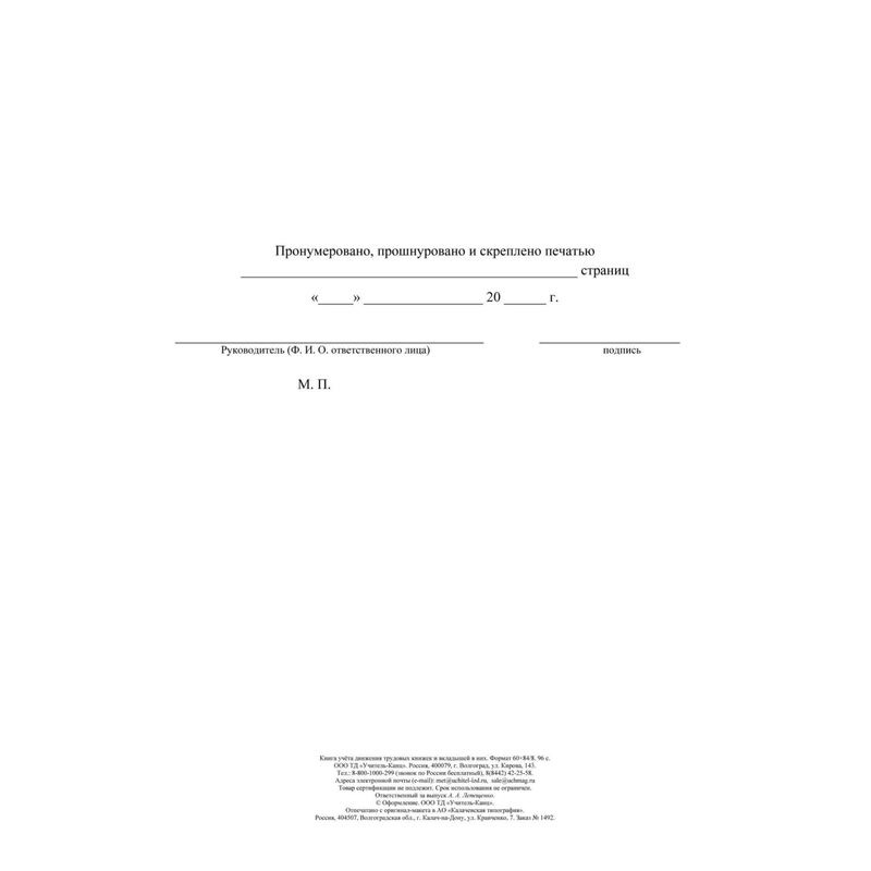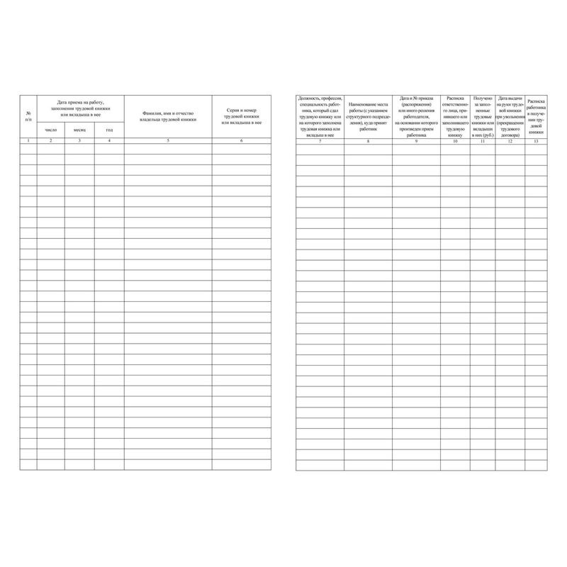 В книге (журнале) по учёту бланков трудовой книжки и вкладыша в неё фиксируются сведения о всех операциях, связанных с получением и расходованием бланков трудовой книжки и вкладыша в неё, с указанием серии и номера каждого бланка.