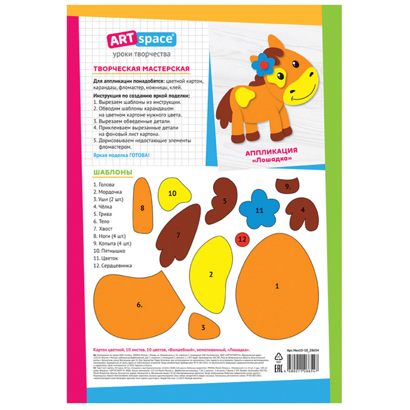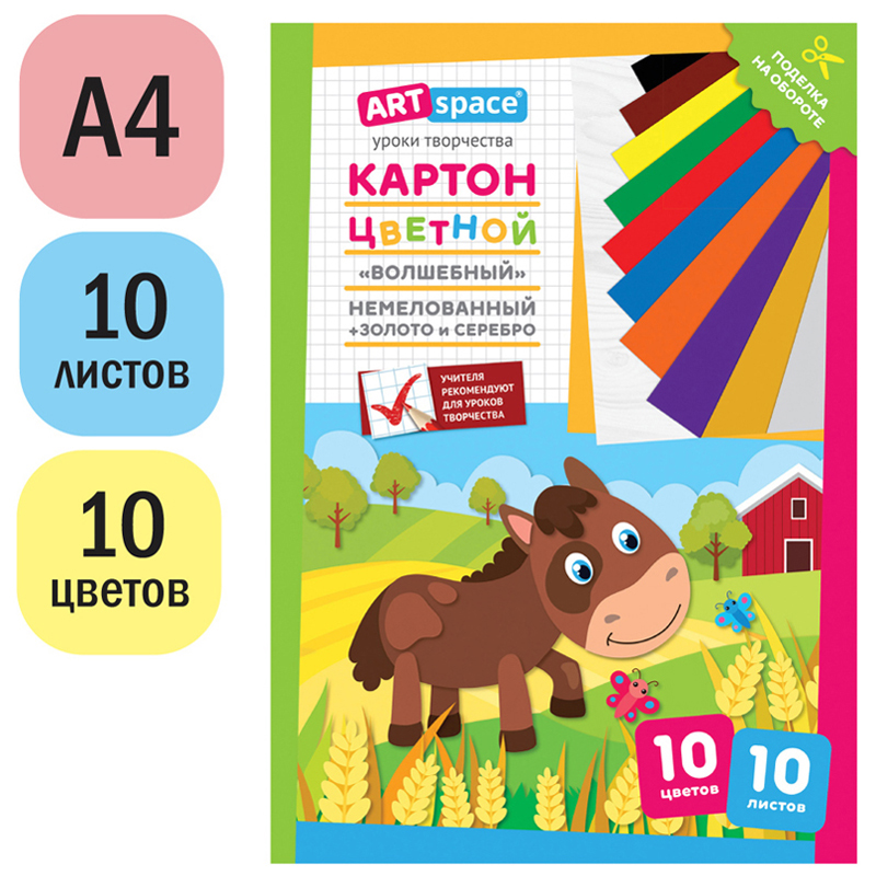 Картон цветной А4, ArtSpace, 10л., 10цв., немелованный, золото, серебро, в папке, "Волшебный. Лошадк [Нкн10-10_28654]