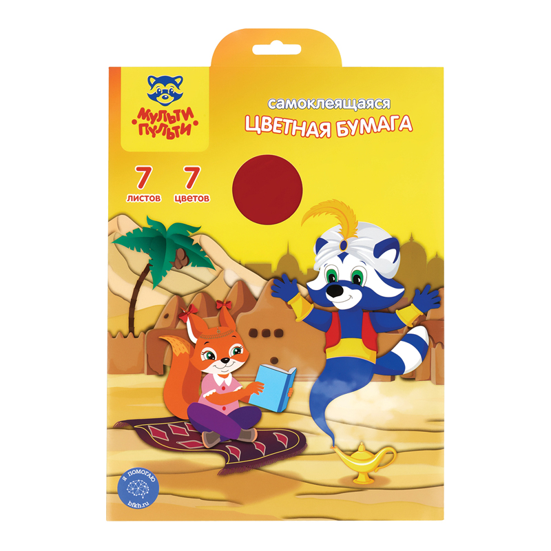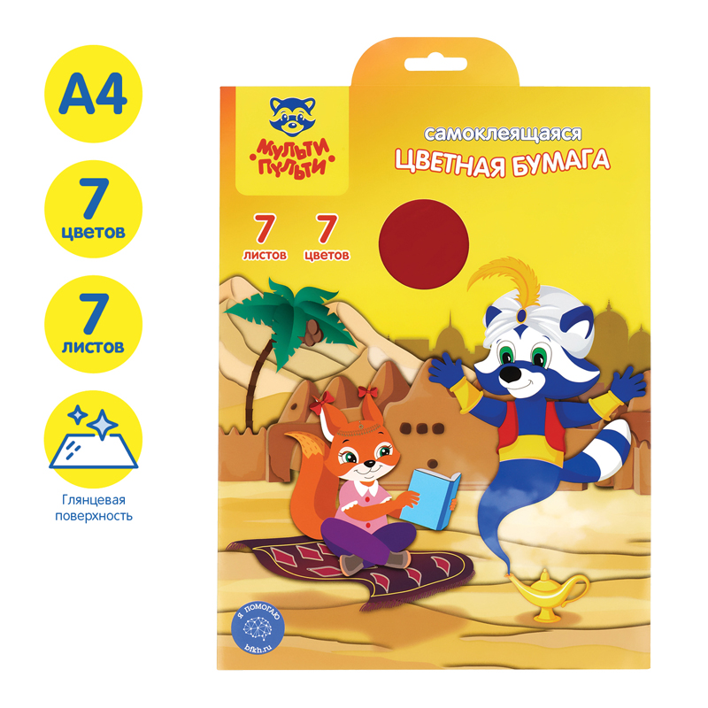 Цветная бумага самоклеящаяся А4, Мульти-Пульти, 7л., 7цв., в папке с европодвесом, "Приключения Енот [БС7А4_11095]