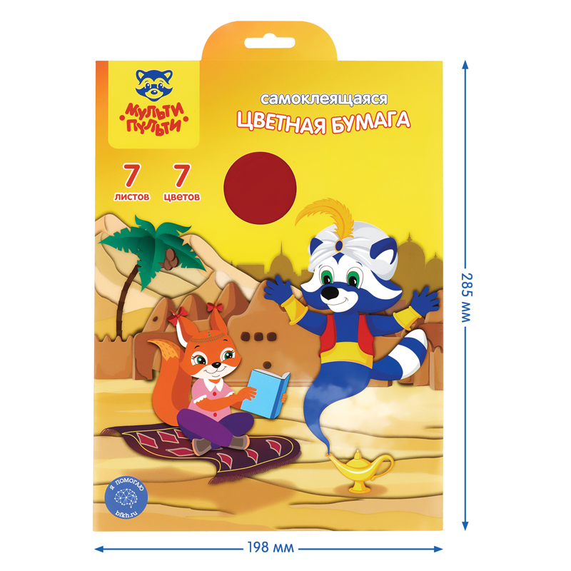 Набор цветной самоклеящейся бумаги «Мульти-Пульти» серии «Приключения Енота» идеально подойдет не только для творчества, но и для украшения открыток и подарков. Бумага формата А4 имеет размер 198*285 мм. В наборе представлено 7 ярких цветов бумаги на 7 листах.Бумага на самоклеящейся основе позволит избежать использования клея и неаккуратных потёков на краях будущих бумажных шедевров. Бумага окрашена с одной стороны и упакована в папку из мелованного картона с европодвесом. Товар сертифицирован для детей от 3 лет.