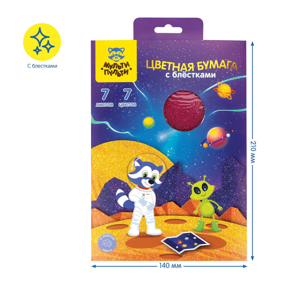 Цветная бумага с блестками А5, Мульти-Пульти, 7л., 7цв., в папке, "Енот в космосе" [ЦБ7А5б_16846]
