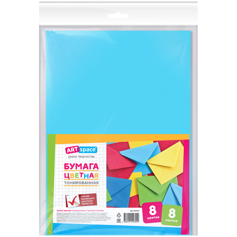 Цветная бумага тонированная А4, ArtSpace, 8л., 8цв., в пакете [264195]