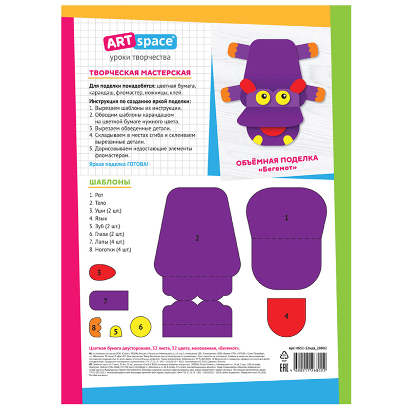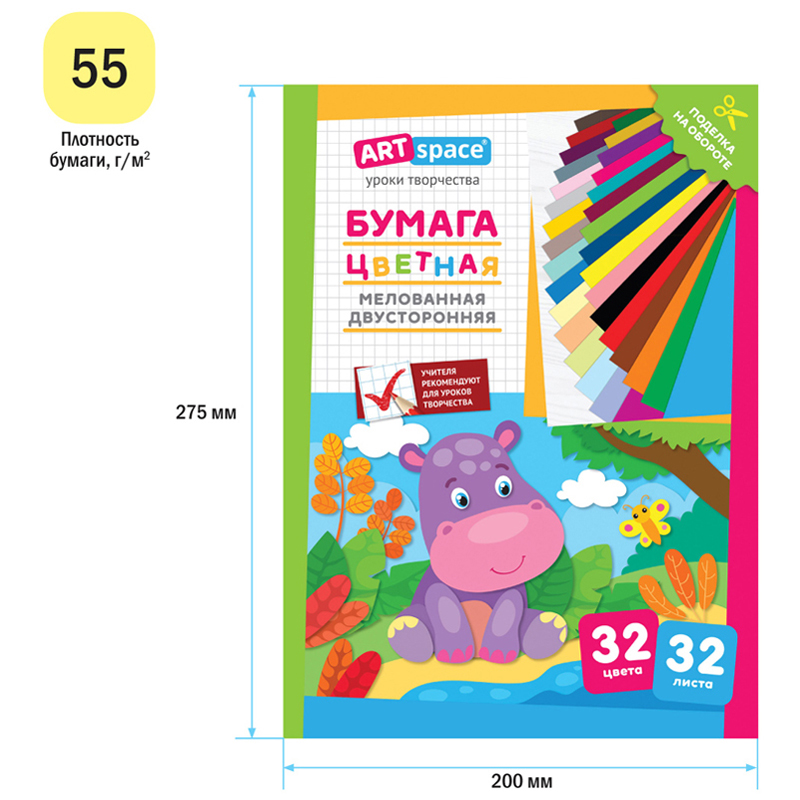Цветная бумага мелованная А4, ArtSpace, двустор., 32л., 32цв., "Бегемот" [Нб32-32мдв_28802]