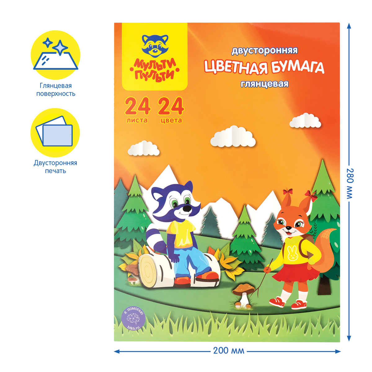 Набор двусторонней цветной бумаги «Мульти-Пульти» серии «Приключения Енота» идеально подойдет для творчества. Бумага имеет размер 200*280 мм. Плотность бумаги – 65 г/м2. В наборе представлено 24 ярких цвета мелованной бумаги на 24 листах.Бумага окрашена с двух сторон и упакована в папку из высококачественного целлюлозного картона. Товар сертифицирован для детей от 3 лет.