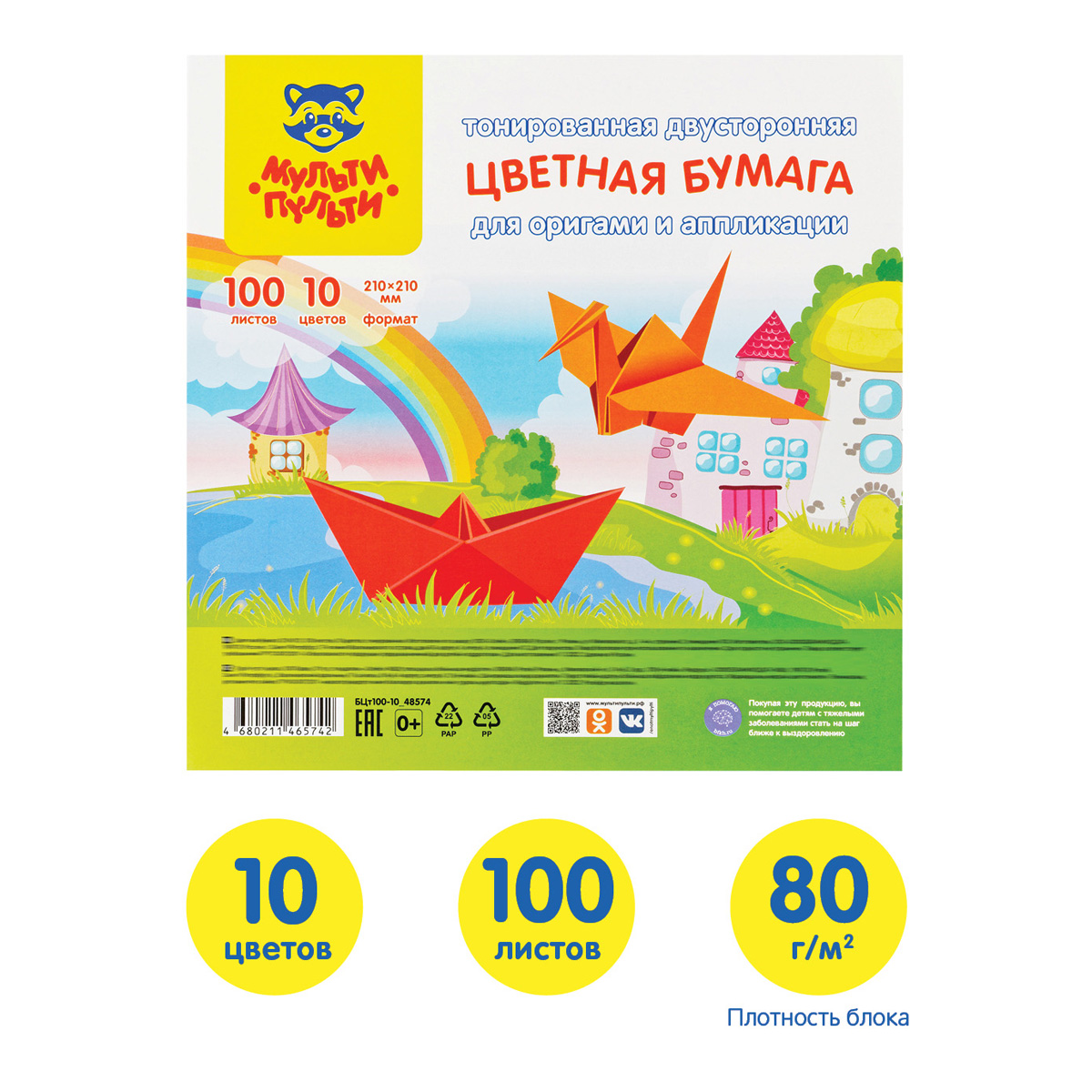 Цветная бумага тонированная 210*210мм, Мульти-Пульти, 100л., 10цв., в пакете, "Енот в России" [БЦт100-10_48574]