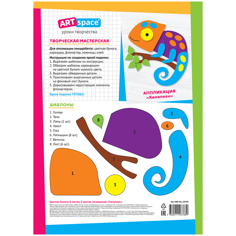Набор цветной бумаги ArtSpace «Хамелеон» идеально подойдет для создания красочных аппликаций, изготовления открыток и поделок. Рекомендована для уроков труда и технологии. Она имеет размер 200*275 мм. Плотность бумаги формата А4 – 55 г/м2. В наборе представлено 8 ярких цветов односторонней мелованной бумаги на 8 листах.Цветная бумага прекрасно подойдет детям для развития моторики и фантазии ребенка. Обложка набора изготовлена из мелованной бумаги, на ней изображён интересный вариант поделки. Тип скрепления – 2 скобы. Транспортная упаковка – крафт-бумага по 50шт.