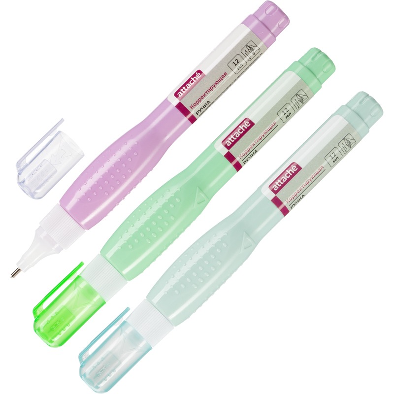 Корректирующая ручка Attache предназначена для точечных исправлений на любых типах бумаги. Данный вид корректировки особенно удобен, если Вам нужно исправить небольшой объем текста или даже самую маленькую помарку. Идеально подходит для студентов и старших школьников. Объем флакона — 12 мл. Металлический наконечник позволяет наносить тонкие линии. Содержит быстросохнущую основу, обладает высокой кроющей способностью.1. Перед применением тщательно встряхните средство в течение не менее 10 секунд, затем снимите колпачок.