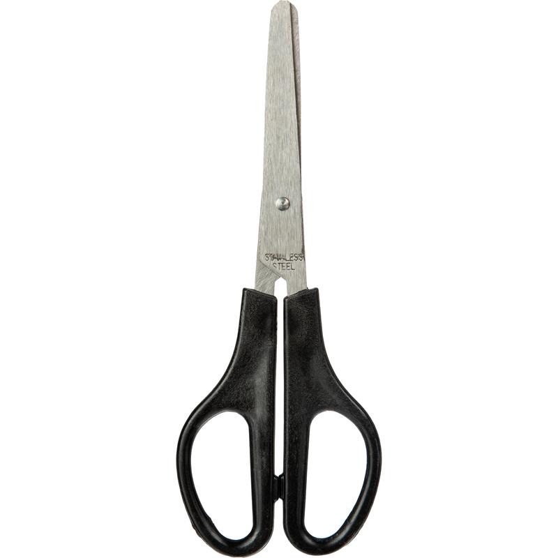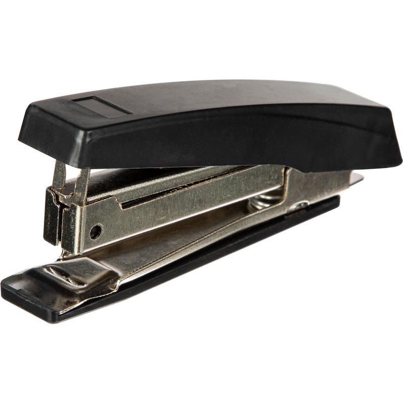 подставка, два карандаша с ластиком, две шариковые ручки, канцелярский нож, точилка, ластик, ножницы (длина - 13 см), блок для записи, линейка, клейкая канцелярская лента (длина - 7 метров, ширина - 12 мм), силовые кнопки, степлер № 10, скобы для степлера № 10, антистеплер, скрепки.