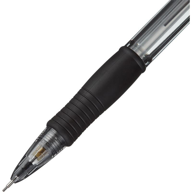 Карандаш механический в прозрачном пластиковом корпусе с резиновым упором, препятствующим выскальзывание карандаша из пальцев, и убирающейся металлической цангой. Корпус - пластик, цвет элементов - черный. Толщина грифеля - 0,7 мм, твердость грифеля - HB.Характеристики
