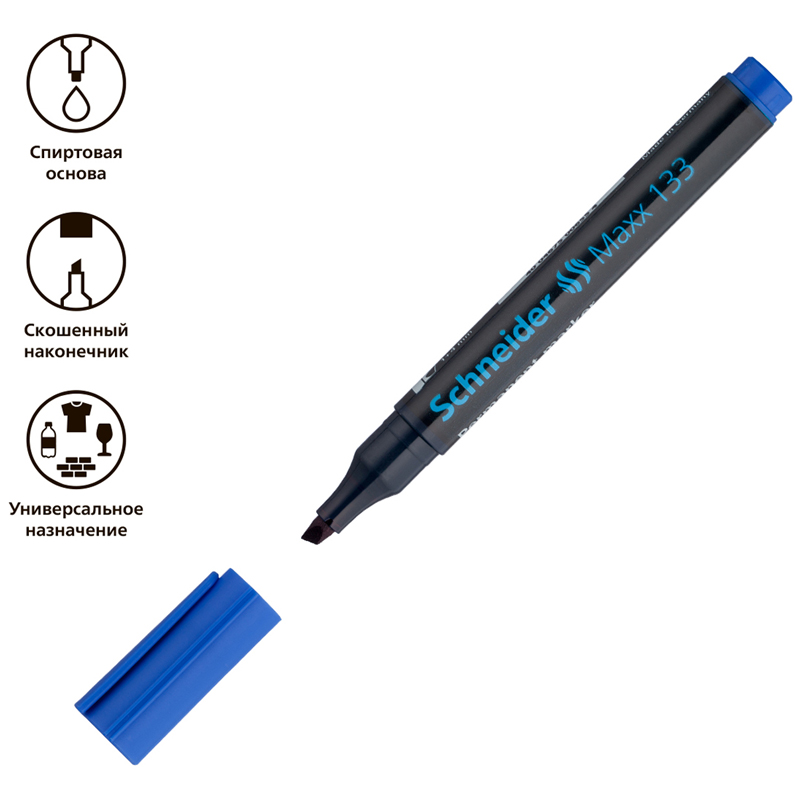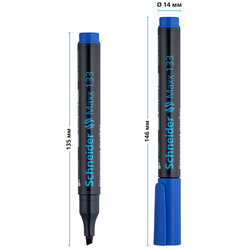 Маркер Schneider Maxx 133 подходит для письма на большинстве твёрдых поверхностей, включая картон, бумагу, металл, стекло, дерево и пластик. Чернила изделия на спиртовой основе. Маркер может находиться без колпачка до 3 дней и не высыхает. У изделия со скошенным наконечником толщина линии письма составляет 4 мм. Маркеры из 10 штук упакованы в картонную коробку.Надписи быстро высыхают, не выцветают и не размываются. Цвет чернил - синий. Круглый корпус маркера диаметром 14 мм выполнен из пластика.