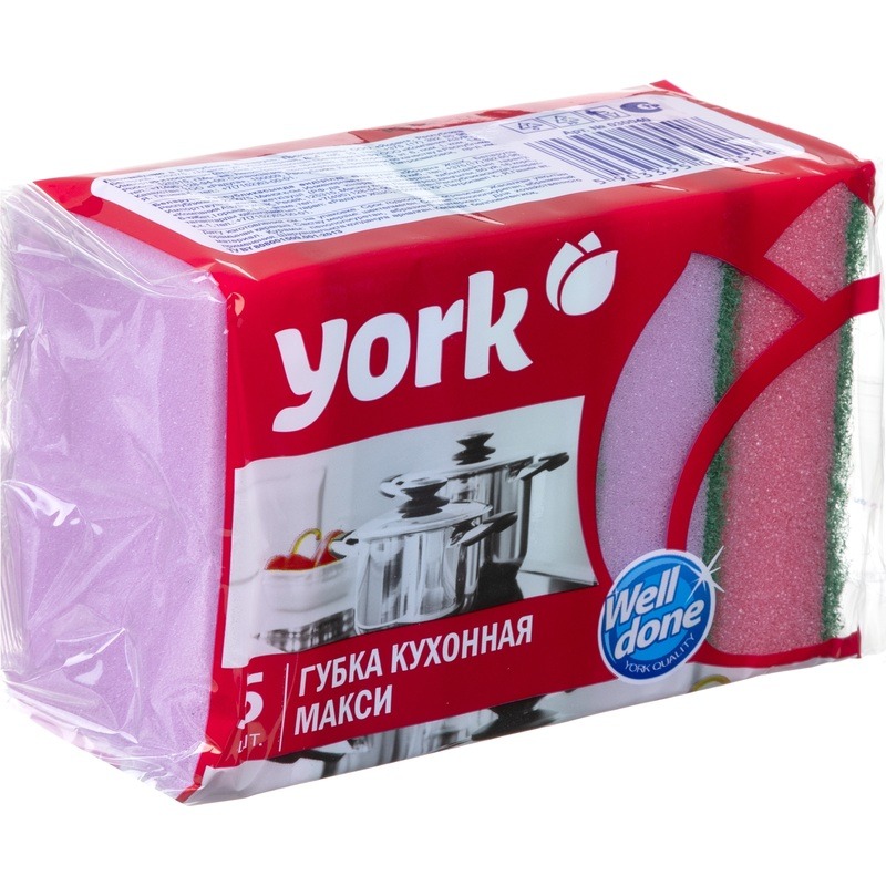 Губка для кухни York Макси поролон 10×7 см с абразивным слоем (5 штук в упаковке)Универсальная губка York — надёжна и удобна в использовании. Она отлично подходит для очистки обширных поверхностей. Прекрасно очищает керамику, стекло, пластик, в также металл. Хорошо пенится. Мягкая сторона — для повседневной и деликатной очистки, в том числе по тефлону. Крепкий абразивный слой из фибры справляется с самыми трудными загрязнениями. Губка York имеет оптимальную форму, отличается длительным сохранением эксплуатационных свойств.