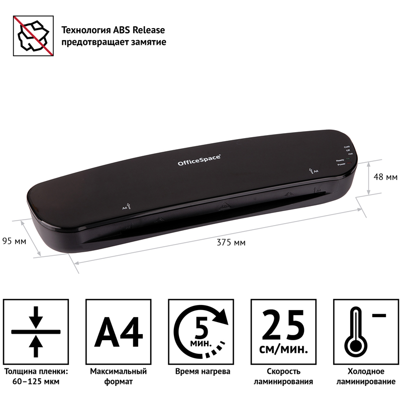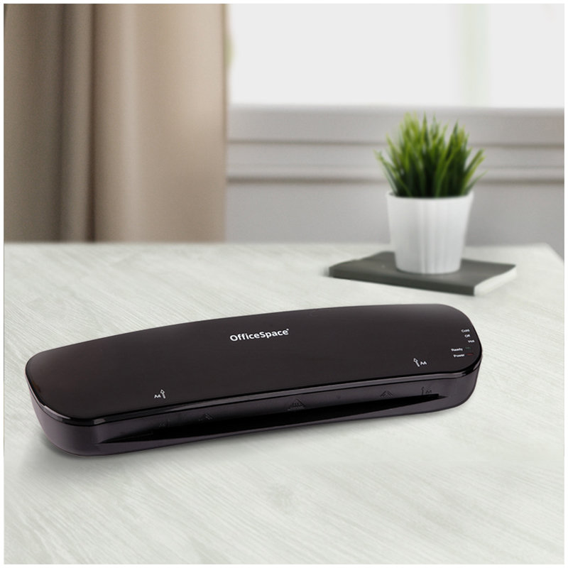 Ламинатор OfficeSpace LM100 предназначен для ламинирования бумаги, фотографий, документов, грамот, сертификатов, пропусков с целью сохранения от влаги, пыли и прочих внешних воздействий в течение длительного времени. Скорость ламинирования - 25 см в минуту. Максимальный формат документа – А4. Толщина пленки от 60 до 125 мкм. Пластиковый корпус и аналоговый интерфейс. Время нагрева – 5 минут. Ширина входного отверстия – 230 мм. Ламинатор представлен в чёрном цвете.Ламинатор LM100 с 2 валами предназначен для ламинирования небольшого количества документов в условиях дома, небольшого офиса или фотостудии. ABS-релиз предотвратит замятие документов. Функция холодного ламинирования позволит нанести самоклеящуюся пленку толщиной от 60 до 125 мкм на бумагу и документы, которые нельзя подвергать воздействию высоких температур.