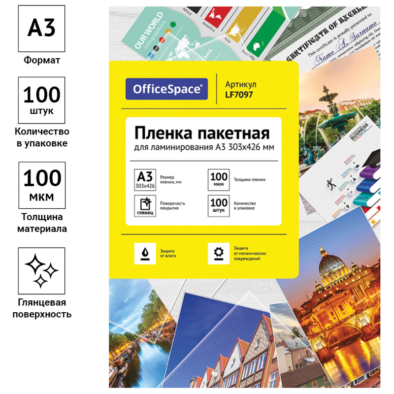 Глянцевая пакетная пленка OfficeSpace формата А3, размером 303*426 мм и толщиной 100 мкм прекрасно подходит для ламинирования документов. Она предназначена для использования в ламинаторах «горячего» типа. В упаковке 100 листов.Плёнка для ламинации OfficeSpace придает документу жесткость, обладает высокой прозрачностью после ламинации, защищает документ от механических повреждений и воздействия влаги.