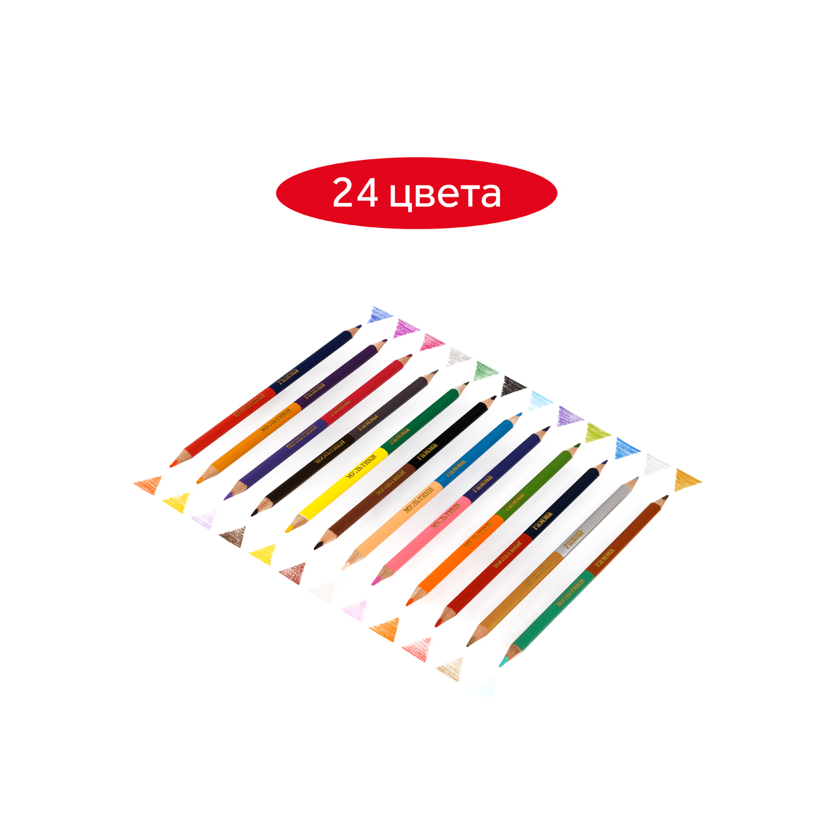 Двусторонние цветные карандаши ГАММА серии «Мультики» помогут экономить место в пенале и получить в 2 раза больше цветов. В наборе 12 карандашей и 24 цвета. Диаметр грифеля — 2,9 мм. Проклеенный ударопрочный грифель не крошится во время заточки и не ломается даже после падения. Корпус карандаша диаметром 7 мм и длиной 174 мм изготовлен из дерева. Эргономичный трехгранный корпус позволяет удобно располагать карандаш в детской руке и предотвращает его скатывание со стола. Специальная обработка натуральной древесины позволяет легко заточить карандаш без зазубрин и заноз. За яркость и высокую укрывистость отвечают качественные пигменты в составе. Ребенку не придется сильно давить на карандаш — рисунок получится ярким и равномерно закрашенным. Упаковка – картонная коробка с европодвесом.• Количество цветов: 24;