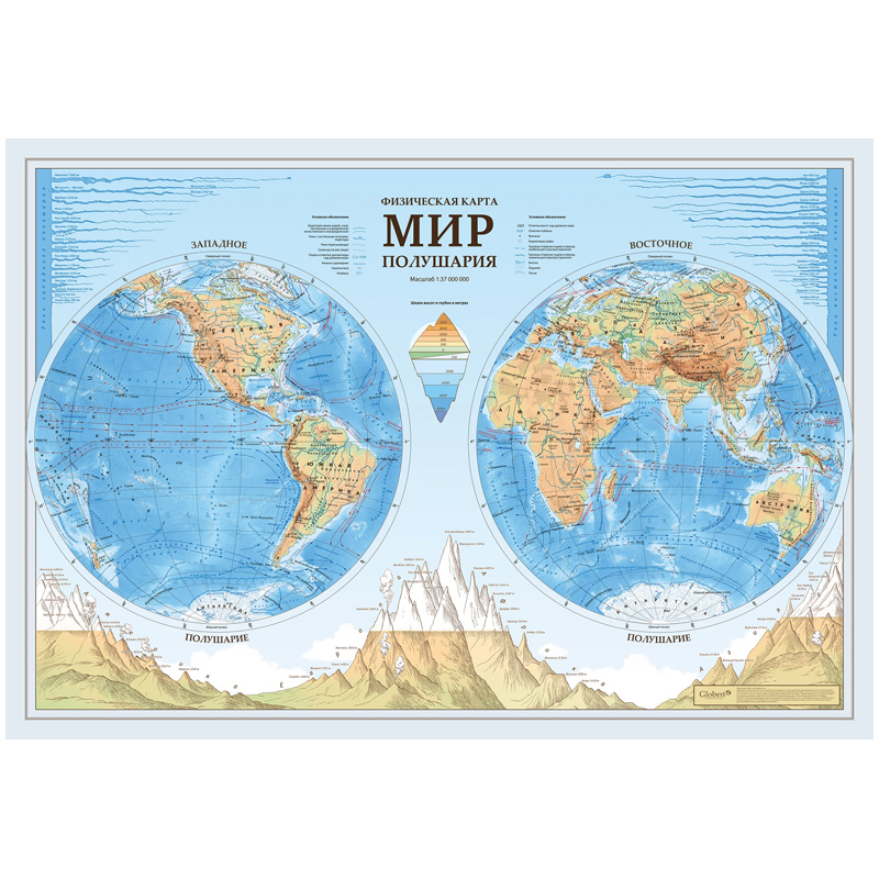 Карта "Мир. Полушария" физическая Globen, 1:37млн., 1010*690мм, с ламинацией [КН090]