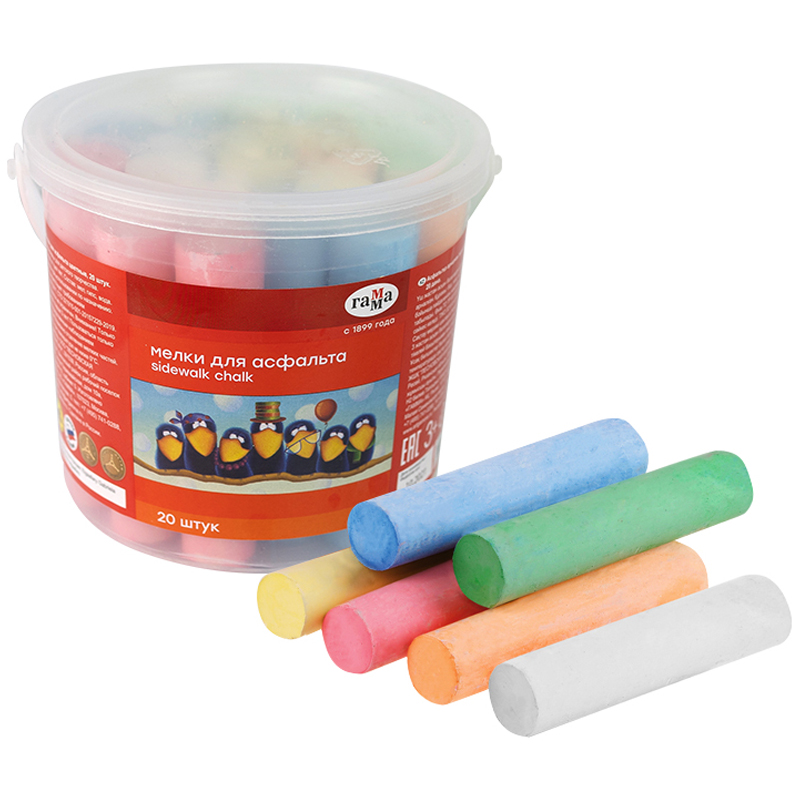 Набор из 20 круглых мелков ГАММА серии «Мультики» подходит для рисования на асфальте и любой шероховатой поверхности и состоит из 6 цветов: 2 белых, 4 желтых, 4 зеленых, 4 синих, 4 красных, 2 оранжевых. Длина — 10 см, диаметр — 22 мм.Удобная форма и мягкое письмо. Натуральный состав на основе мела, гипса, воды и пигментов, без выраженного запаха, средняя твердость. Следы мелков легко счищаются с рук. Набор упакован в пластиковое ведро.