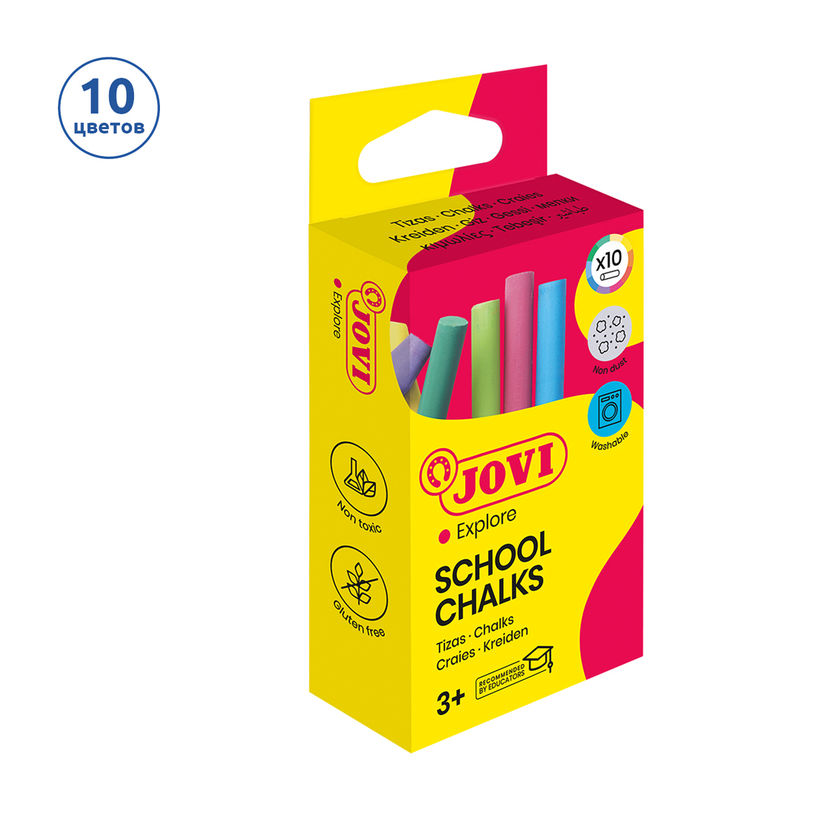 Высококачественные круглые цветные мелки JOVI предназначены для школьных досок, рисования на асфальте, бумаге, ткани и других поверхностях. Диаметр мелка составляет 9 мм, а длина — 80 мм. В наборе 10 ярких цветов: жёлтый, красный, синий, салатовый, голубой, сиреневый, оранжевый, розовый, зелёный, светло-коричневый. Мел средней твёрдости изготовлен из карбоната кальция. Мелки имеют высокую покрывающую способность, не крошатся, легко стираются и не царапают поверхность. Упакованы в картонную коробку с европодвесом. Страна производства — Иордания. НЕ РЕКОМЕНДОВАНО ДЛЯ ПИТАНИЯ• Длина мелка: 80 мм;