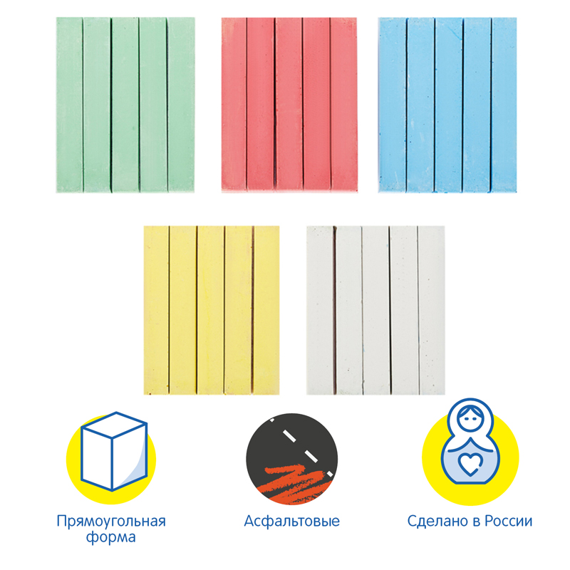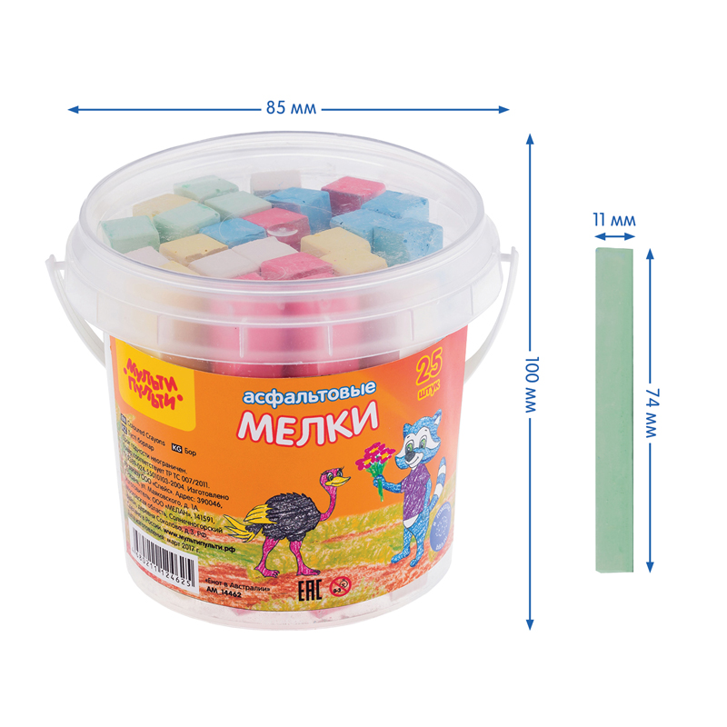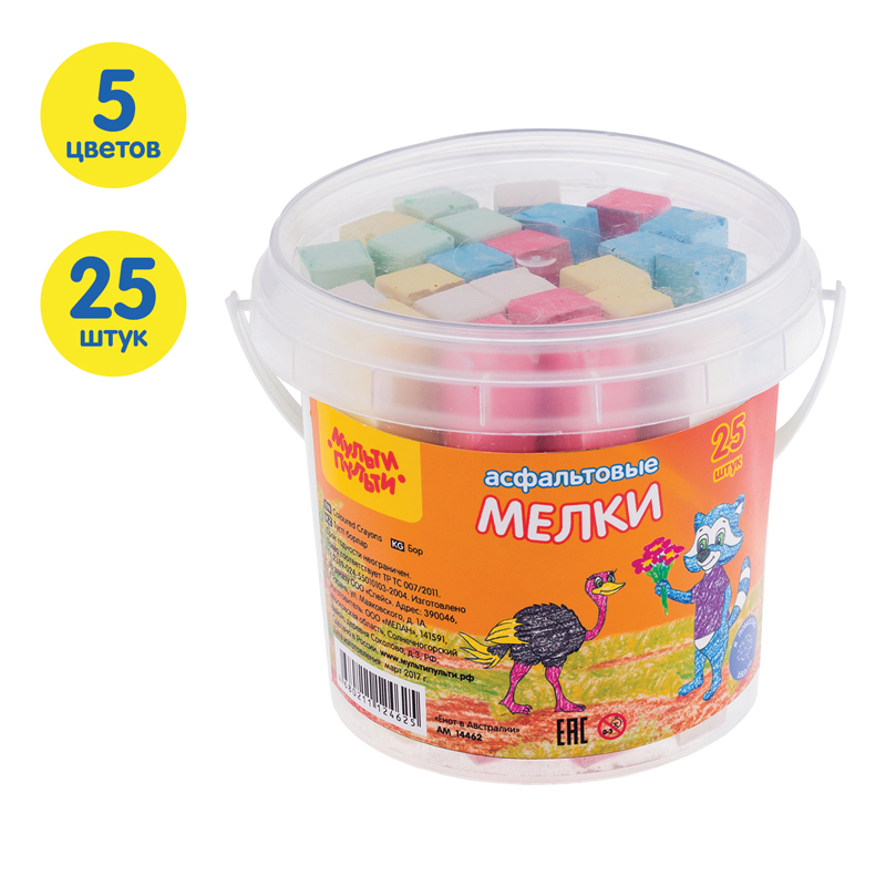 Набор из 25 прямоугольных мелков для асфальта «Мульти-Пульти» серии «Енот в Австралии» идеально подходит для рисования на любой шероховатой поверхности. Длина мелка —75 мм, а сторона основания составляет 11 мм. В наборе 25 асфальтовых мелков в 5 цветах: белый, жёлтый, голубой, красный и зелёный. Мел средней твёрдости нетоксичен и изготовлен из натуральных компонентов, подходит для детей старше 3-х лет.Упакованы в пластиковое ведро с крышкой, которое обязательно понравится ребёнку. НЕ РЕКОМЕНДОВАНО ДЛЯ ПИТАНИЯ.