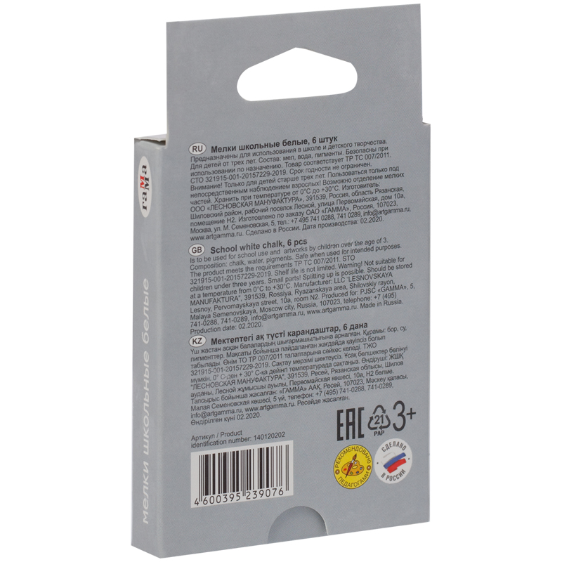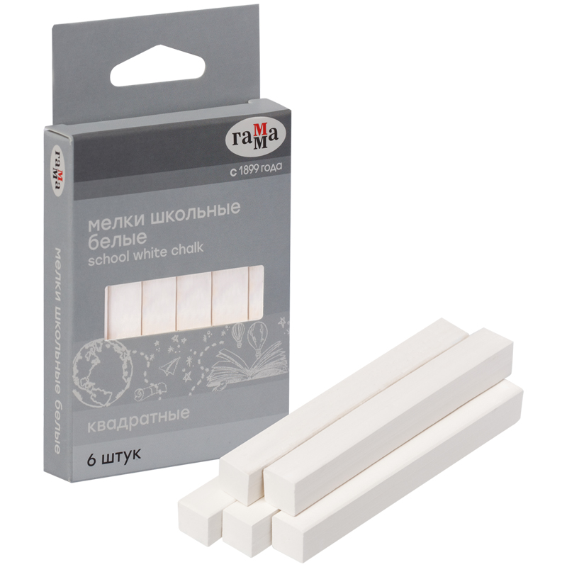 Набор из 6 квадратных школьных белых мелков ГАММА для классных и аудиторных досок, а также для рисования на асфальте. В упаковке 6 штук.Удобная форма и мягкое письмо. Мягкие мелки состоят на 95% из натурального мела и не содержат гипс. Не имеют выраженного запаха и не пылят при письме. Следы мелков легко очищаются с рук. Подходят для детей старше 3-х лет. Набор упакован в картонную коробку с европодвесом.