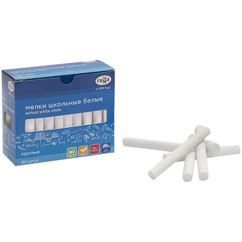 Набор из 50 круглых школьных белых мелков ГАММА для классных и аудиторных досок, а также для рисования на асфальте. В упаковке 50 штук.Удобная круглая форма и мягкое письмо. Мягкие мелки состоят на 95% из натурального мела и не содержат гипс. Подходят для детей старше 3-х лет. Не имеют выраженного запаха и не пылят при письме. Следы мелков легко очищаются с рук. Набор упакован в картонную коробку с европодвесом. Большие наборы мелков оптимальны для школьных занятий и творческого отдыха всей семьёй.