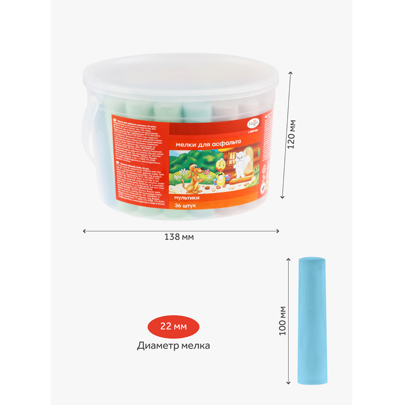 Набор из 36 круглых мелков ГАММА серии «Мультики» подходит для рисования на асфальте и любой шероховатой поверхности и состоит из 9 цветов: белый, желтый, зеленый, синий, красный, оранжевый, коричневый, бирюзовый, фиолетовый. Длина — 10 см, диаметр — 22 мм.Удобная форма и мягкое письмо. Натуральный состав на основе мела, гипса, воды и пигментов, без выраженного запаха, средняя твердость. Следы мелков легко счищаются с рук. Для детей старше 3-х лет. Набор упакован в пластиковое ведро с ручкой для удобства переноски и хранения.