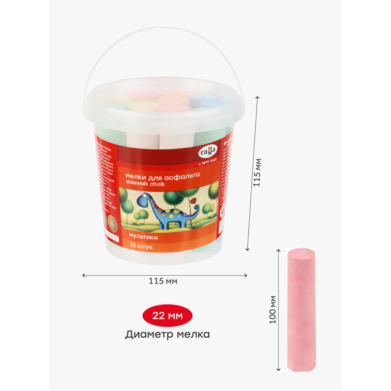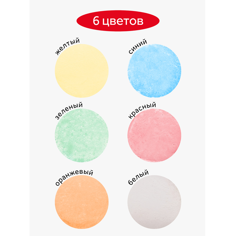 Мелки для рисования на асфальте 6 цветов «ГАММА» серии «Мультики» подходят для рисования на любой шероховатой поверхности. Набор состоит из 6 цветов: белый, желтый, зеленый, синий, красный, оранжевый. Длина − 10 см, диаметр − 22 мм.Удобная круглая форма и мягкое письмо. Натуральный состав на основе мела, гипса, воды и пигментов, без выраженного запаха, средняя твердость. Мел легко счищаются с рук. Набор упакован в пластиковое ведро.