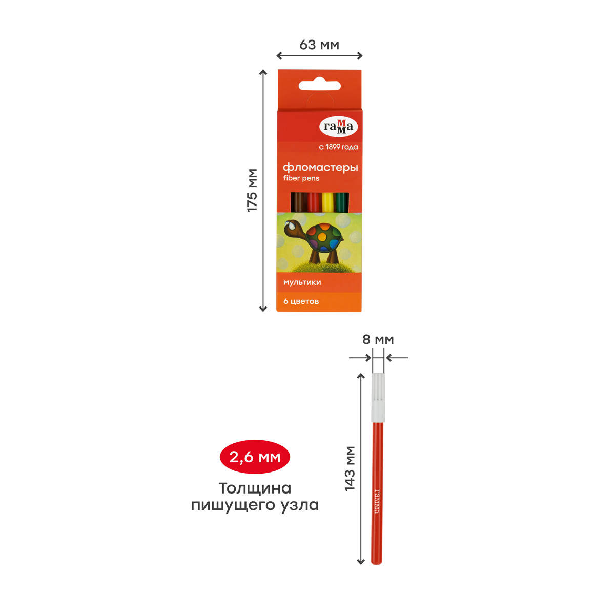 Фломастеры ГАММА серии «Мультики» созданы для комфортного детского творчества. В наборе 6 насыщенных цветов: чёрный, зелёный, красный, синий, жёлтый, коричневый. Тип наконечника – конический. Толщина пишущего узла – 2,6 мм позволяет наносить как тонкие, так и толстые линии для создания ярких рисунков. Чернила на основе воды и пищевых красителей легко смываются с одежды и рук. Вентилируемый колпачок обеспечивает безопасность ребенка в творческом процессе – при случайном проглатывании он не препятствует дыханию. При этом наконечник фломастера изолирован и чернила не высыхают. Корпус круглой формы диаметром 8 мм изготовлен из безопасного полипропилена и имеет удобную круглую зону захвата. Набор фломастеров упакован в красочную картонную упаковку с европодвесом, которая может вдохновить ребёнка на творчество. Продукция морозоустойчива.• Количество цветов: 6;
