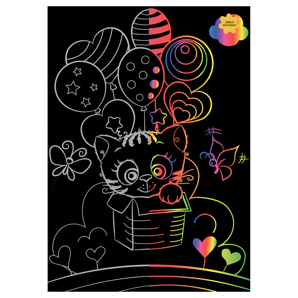 Гравюра с мультицветной основой ТРИ СОВЫ "Котик в коробке", А4 [GA4_49936]